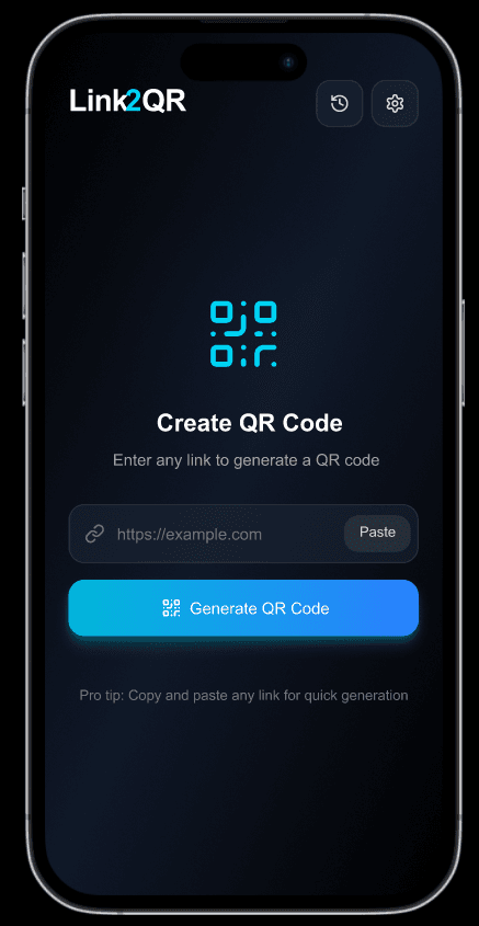 The experience is intentionally simple: users can paste a link, generate a QR code in one action, and manage previously generated codes through a dedicated history section.