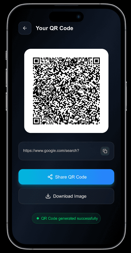 A minimal, mobile-first QR generation app is designed that enables users to convert any link into a QR code instantly. The product focuses on speed, clarity, and trust, eliminating unnecessary steps, ads, and visual noise commonly found in existing QR tools.